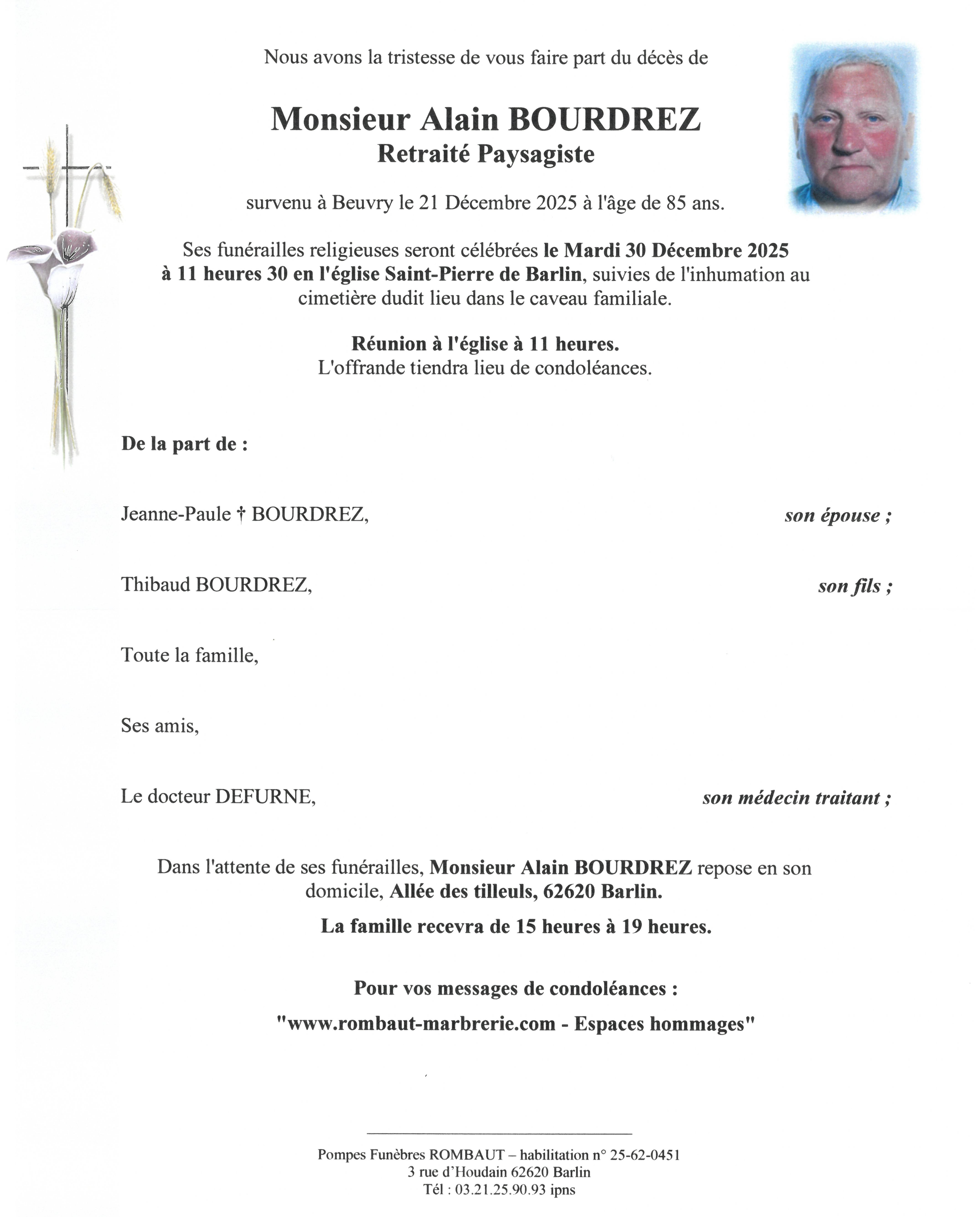 C’est avec une grande tristesse que nous vous annonçons le décès d’Alain BOURDREZ survenu le dimanche 21 décembre 2025 à Beuvry. La cérémonie se déroulera le mardi 30 décembre 2025 à 11h30 à l’adresse suivante : Église Saint-Pierre - rue Francisco Ferrer - 62620 Barlin.