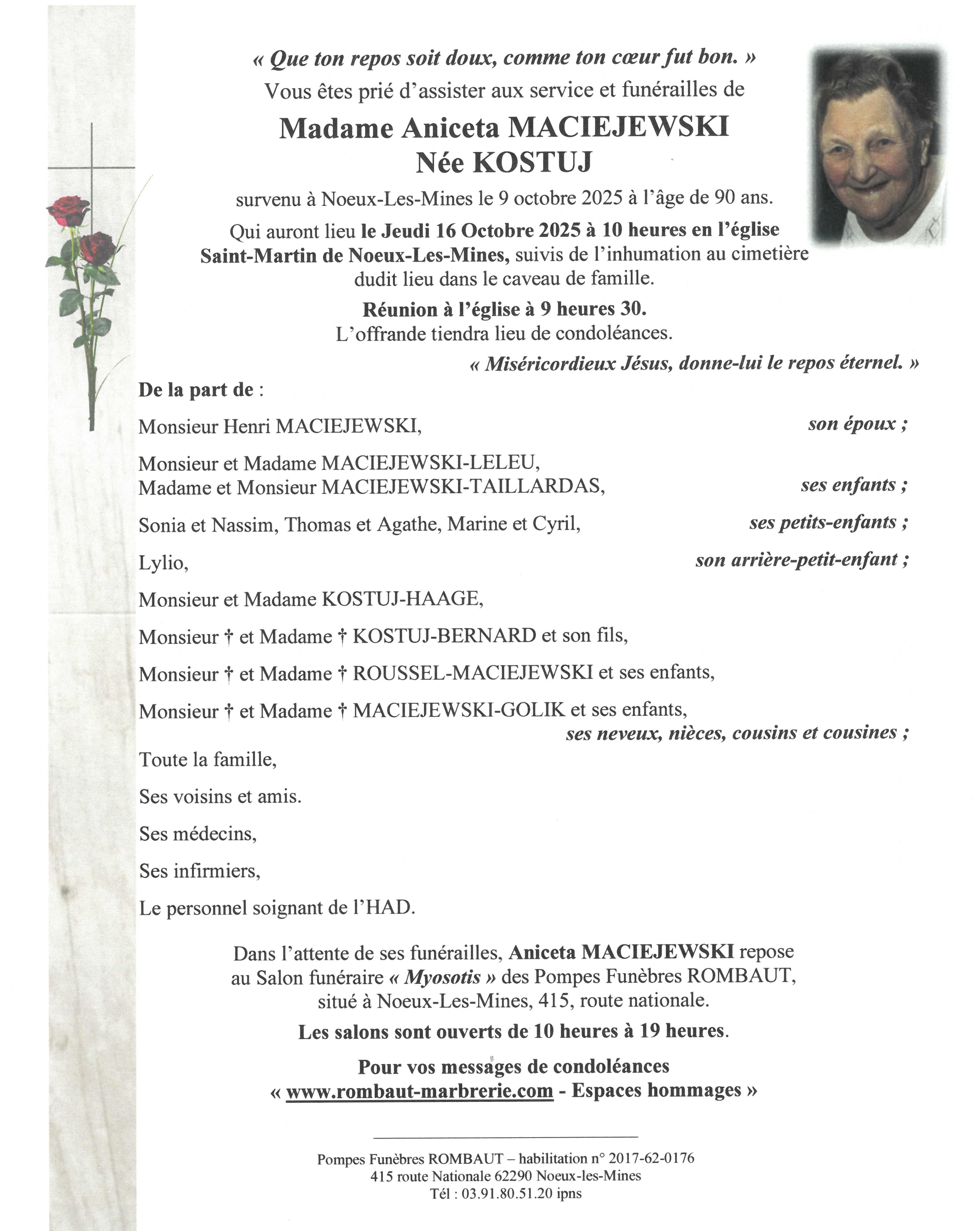 C’est avec une grande tristesse que nous vous annonçons le décès d’Aniceta MACIEJEWSKI survenu le jeudi 09 octobre 2025 à Nœux-les-Mines.