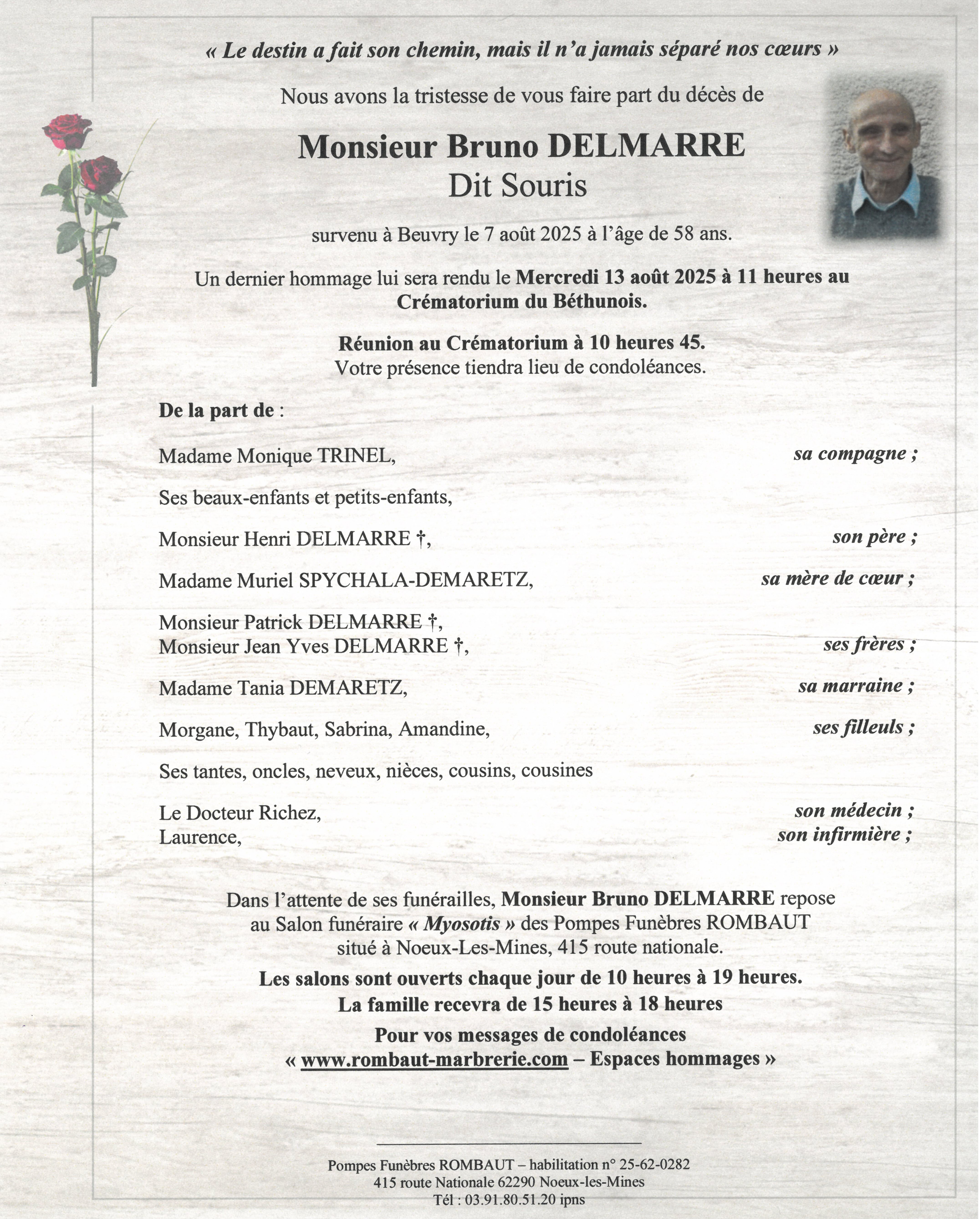 C’est avec une grande tristesse que nous vous annonçons le décès de Bruno DELMARRE survenu le jeudi 07 août 2025 à Beuvry.