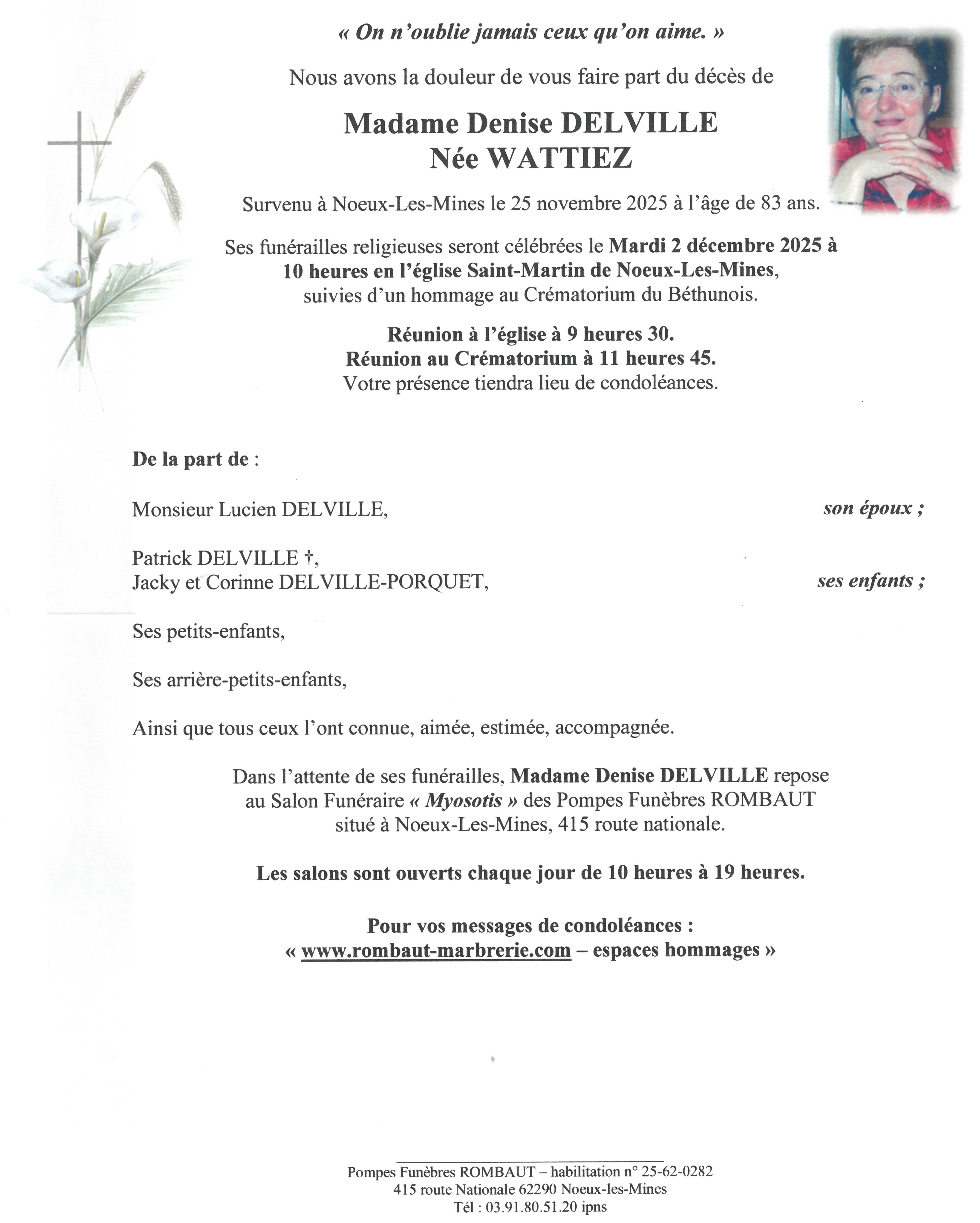C’est avec une grande tristesse que nous vous annonçons le décès de Denise DELVILLE survenu le mardi 25 novembre 2025 à Nœux-les-Mines.