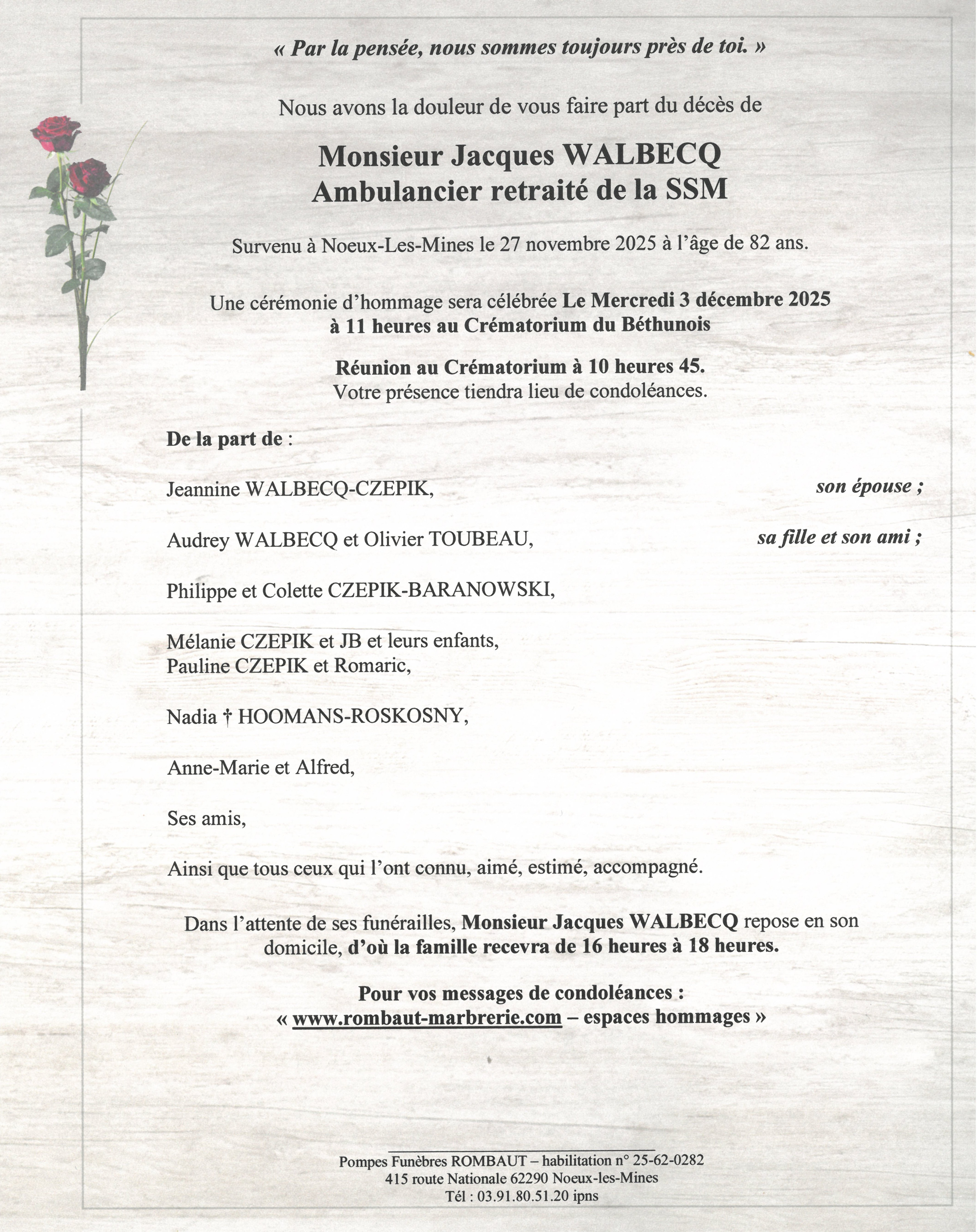 Nous vous invitons à utiliser cet espace pour laisser vos condoléances, partager des photos souvenirs, une anecdote ou exprimer vos pensées à travers des poèmes ou des textes. Cet endroit est un lieu d'expression dédié à honorer la mémoire de Jacques WALBECQ.