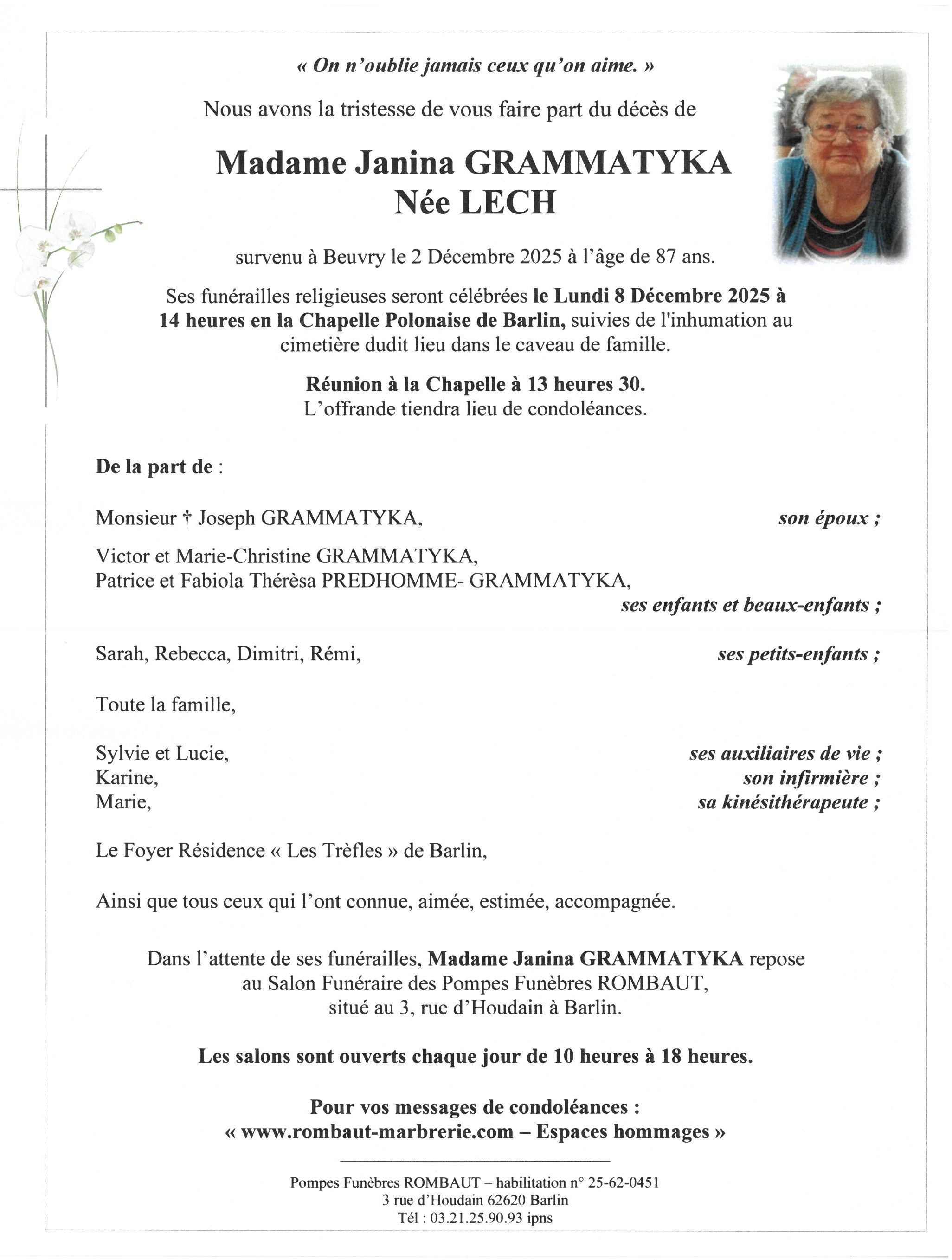C’est avec une grande tristesse que nous vous annonçons le décès de Janina GRAMMATYKA survenu le mardi 02 décembre 2025 à Beuvry.