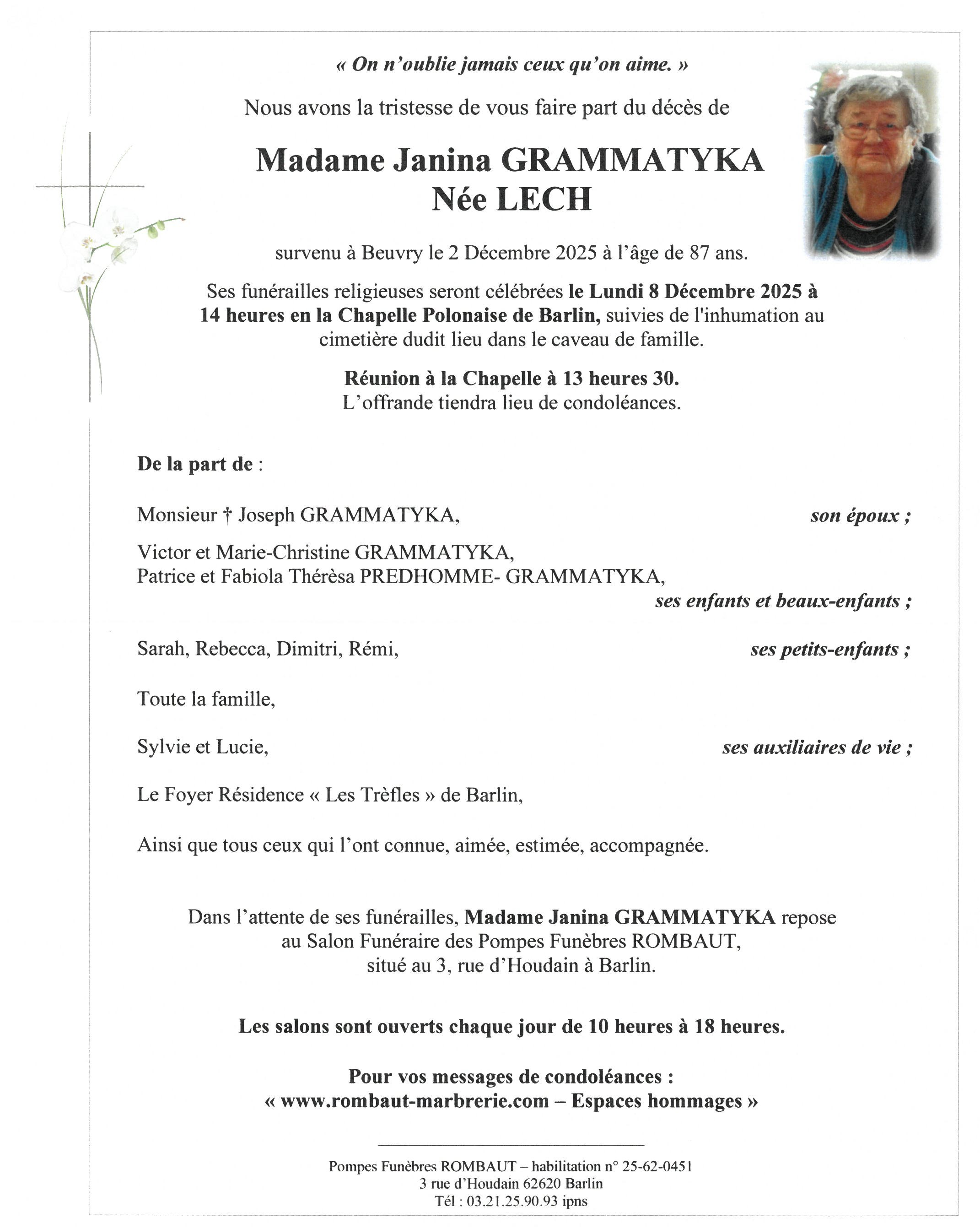 C’est avec une grande tristesse que nous vous annonçons le décès de Janina GRAMMATYKA survenu le mardi 02 décembre 2025 à Beuvry. La cérémonie se déroulera le lundi 08 décembre 2025 à 14h00 à l’adresse suivante : Chapelle Polonaise de Barlin - 32, Rue François Arago - 62620 Barlin.