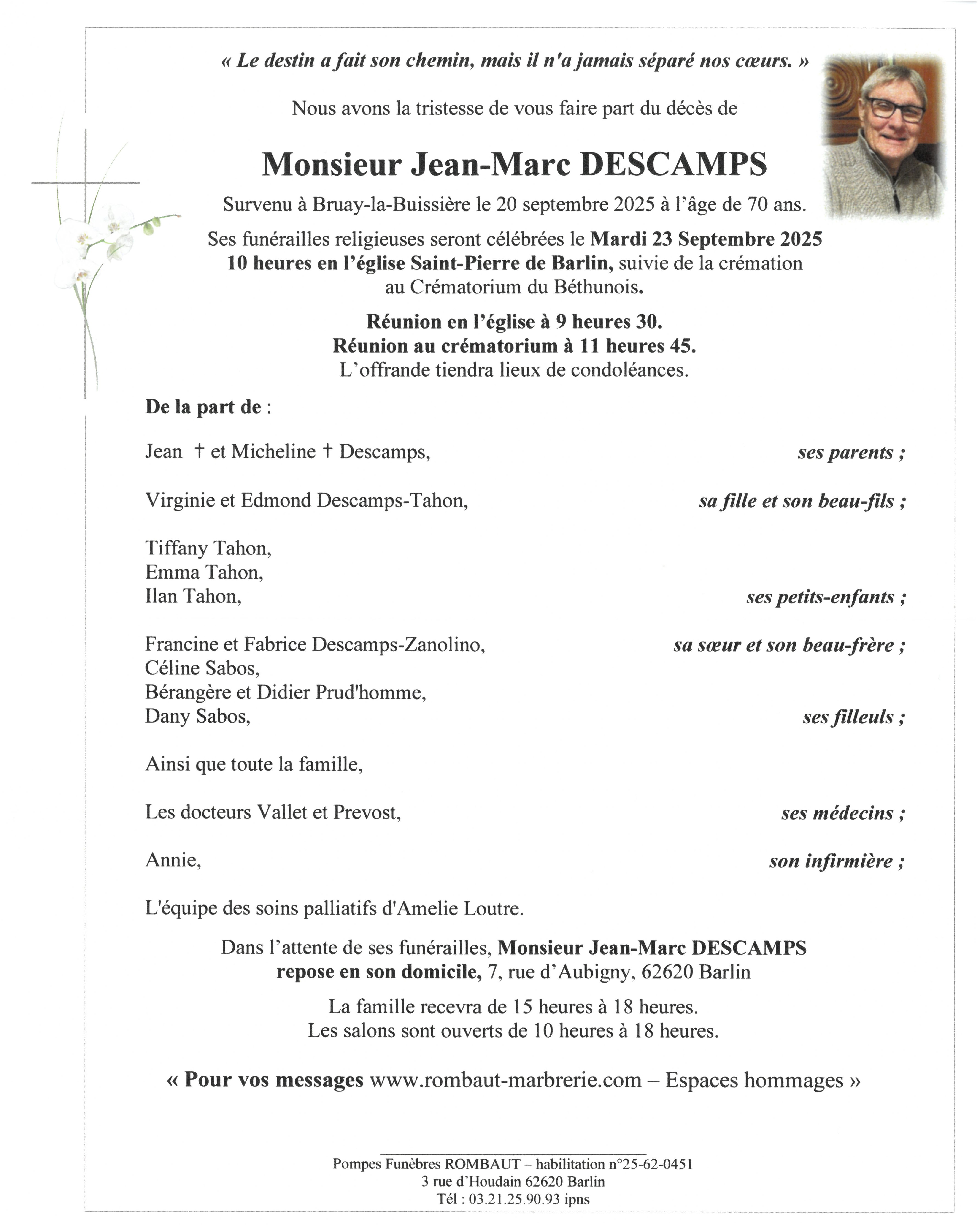 C’est avec une grande tristesse que nous vous annonçons le décès de Jean-Marc DESCAMPS survenu le samedi 20 septembre 2025 à Bruay-la-Buissière.