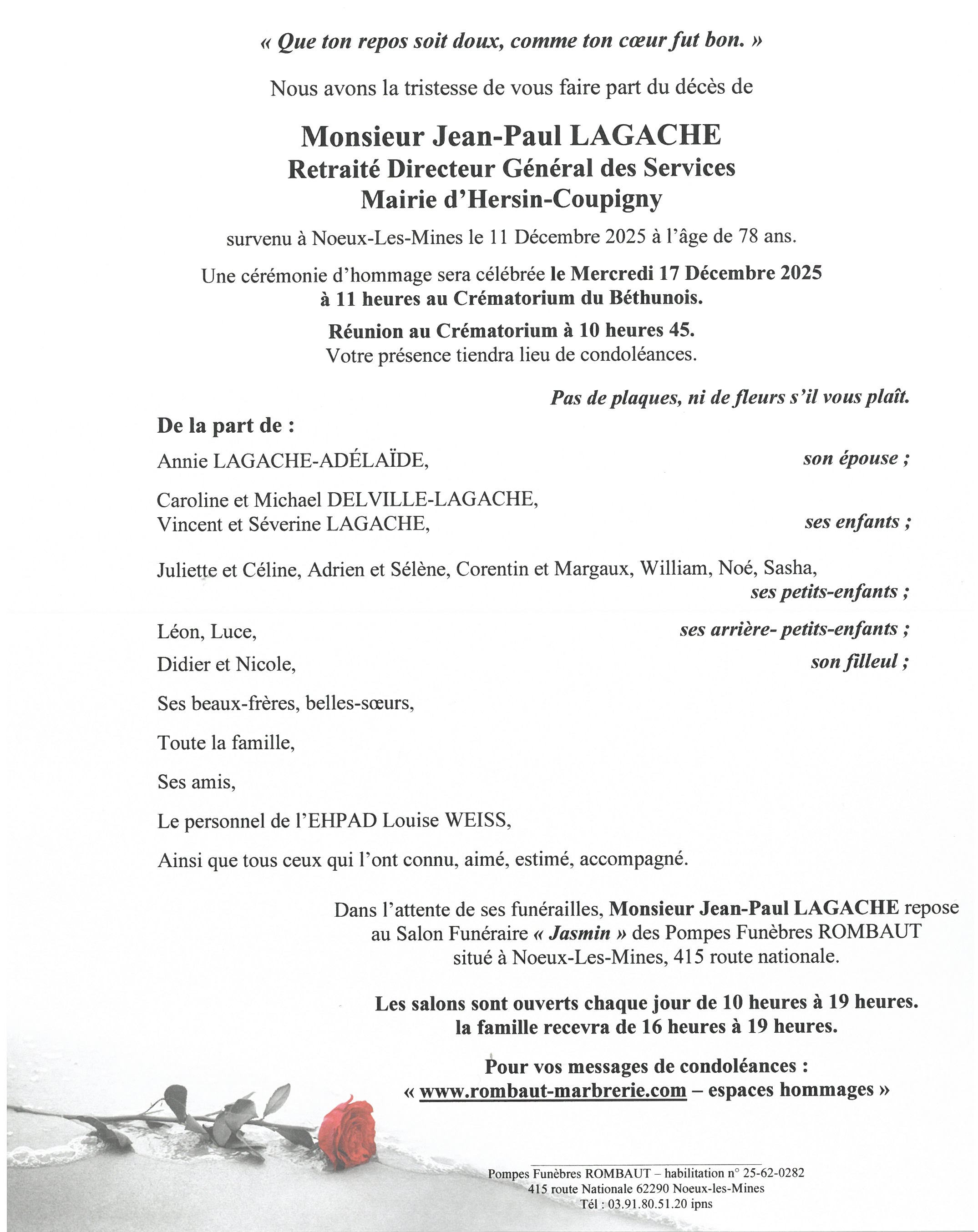 C’est avec une grande tristesse que nous vous annonçons le décès de Jean-Paul LAGACHE survenu le jeudi 11 décembre 2025 à Noeux-les-Mines.