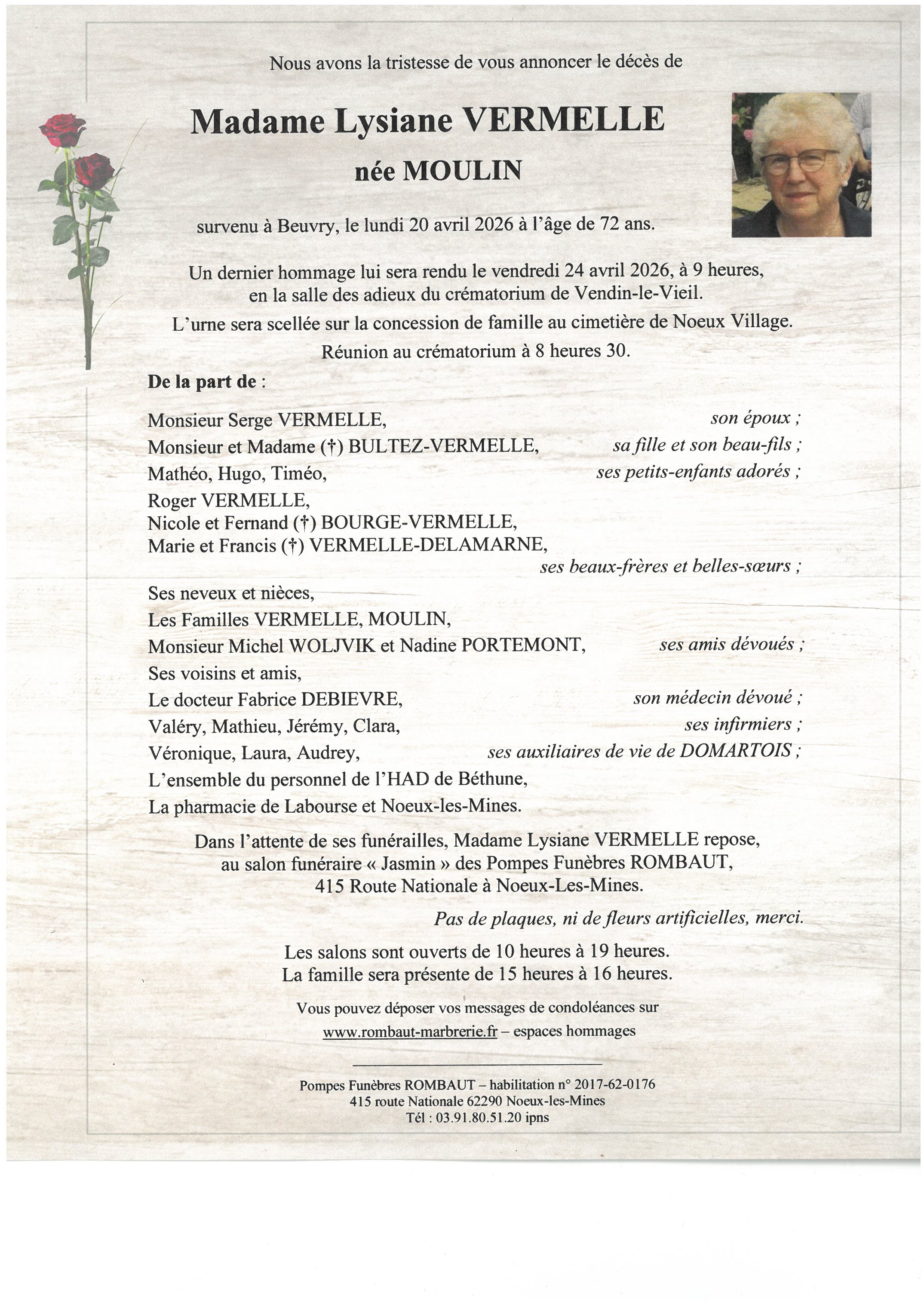 C’est avec une grande tristesse que nous vous annonçons le décès de Lysiane VERMELLE survenu le lundi 20 avril 2026 à Beuvry.