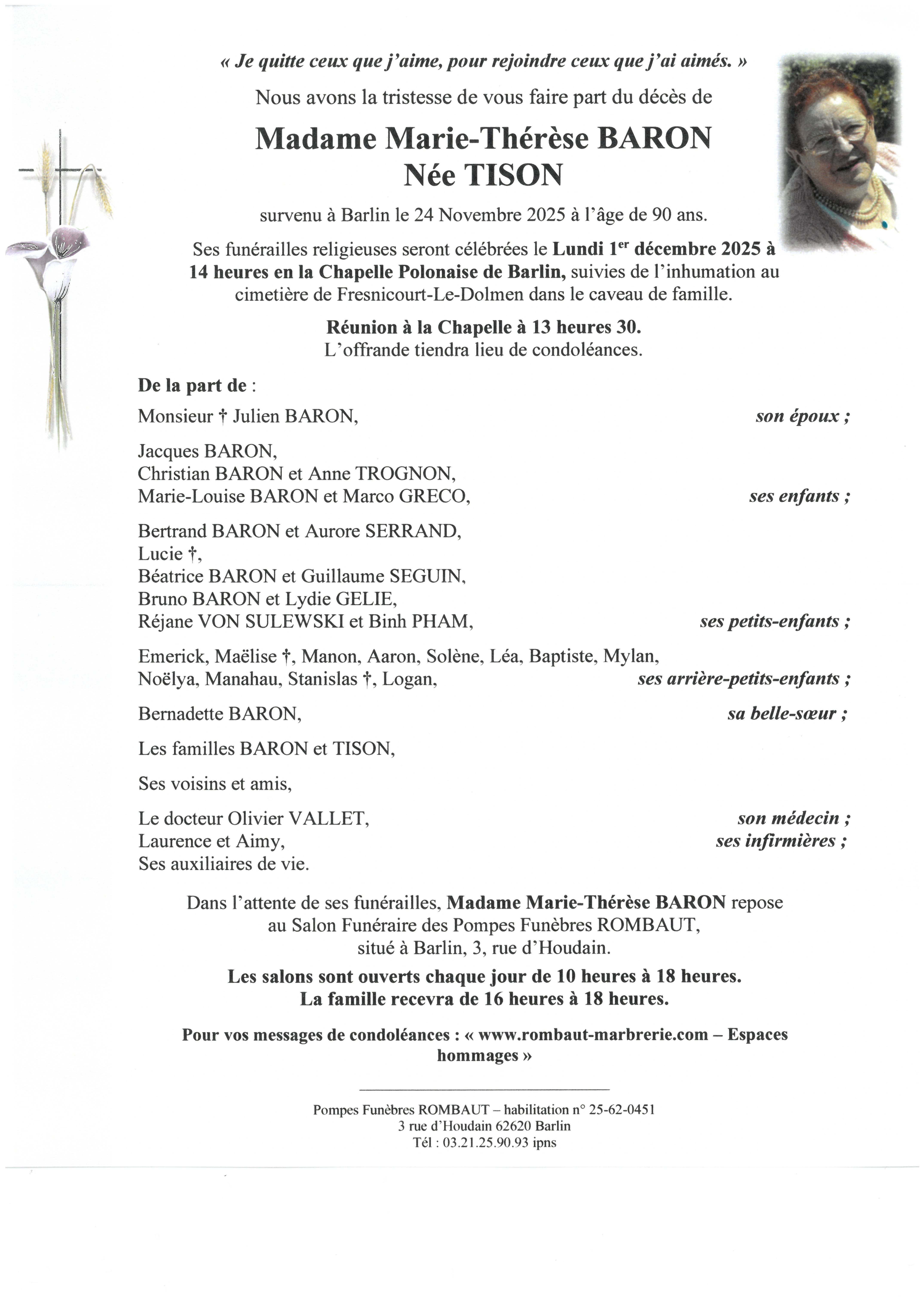C’est avec une grande tristesse que nous vous annonçons le décès de Marie-Thérèse BARON survenu le lundi 24 novembre 2025 à Barlin.