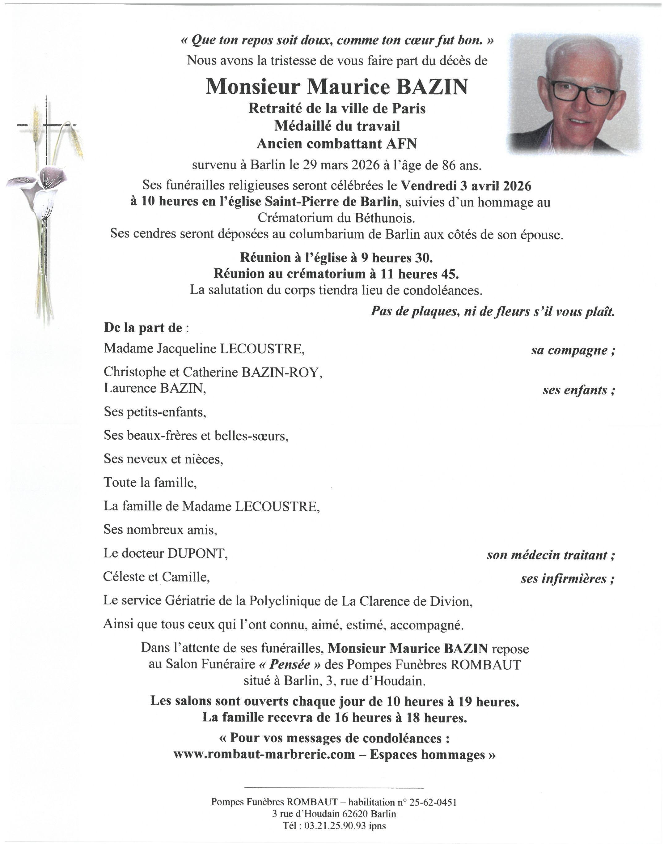 C’est avec une grande tristesse que nous vous annonçons le décès de Maurice BAZIN survenu le dimanche 29 mars 2026 à Barlin. La cérémonie se déroulera le vendredi 03 avril 2026 à 10h00 à l’adresse suivante : Église Saint-Pierre - rue Francisco Ferrer - 62620 Barlin.