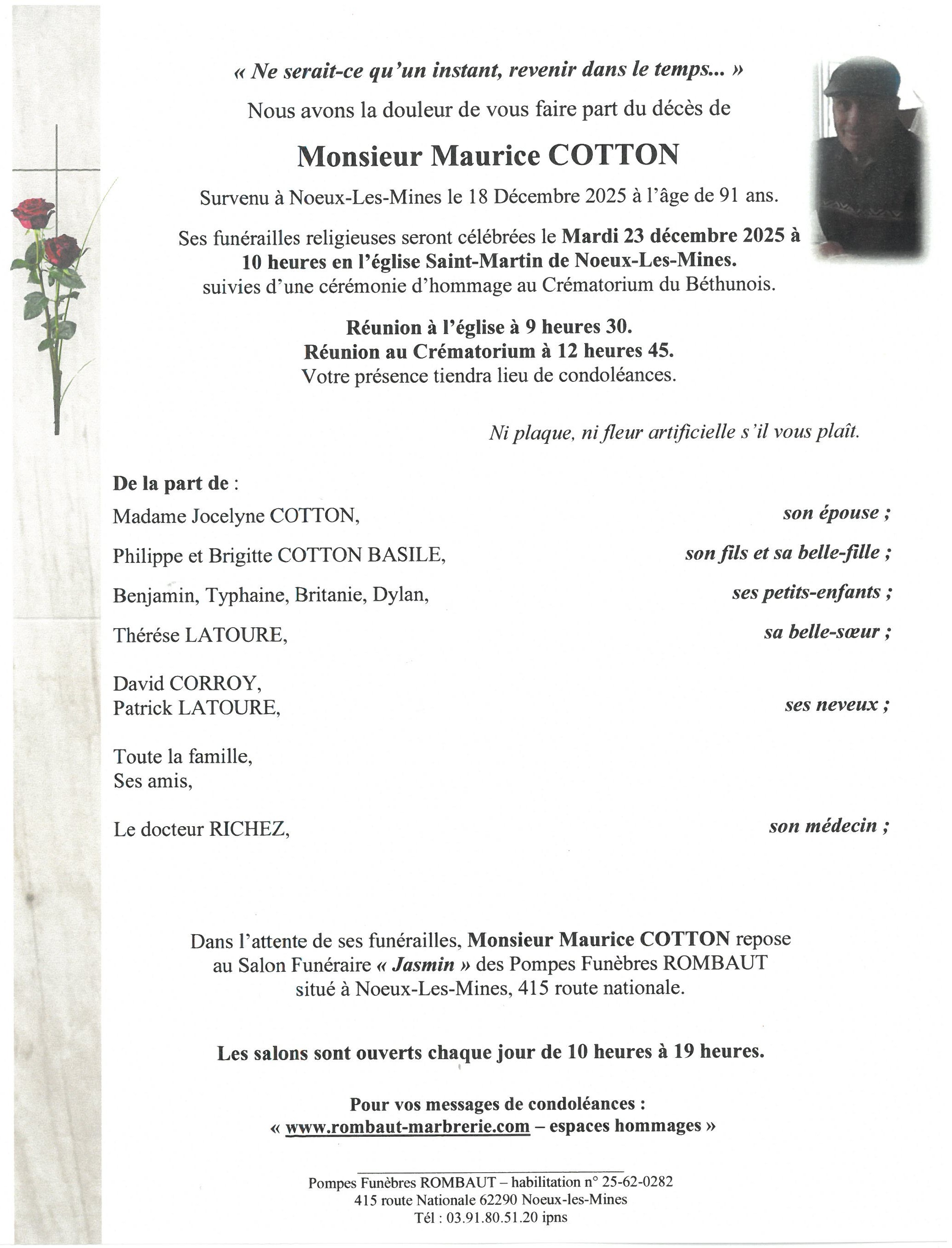 C’est avec une grande tristesse que nous vous annonçons le décès de Maurice COTTON survenu le jeudi 18 décembre 2025 à Nœux-les-Mines. La cérémonie se déroulera le mardi 23 décembre 2025 à 10h00 à l’adresse suivante : Église Saint Martin - rue du Presbytère - 62290 Noeux-les-Mines.