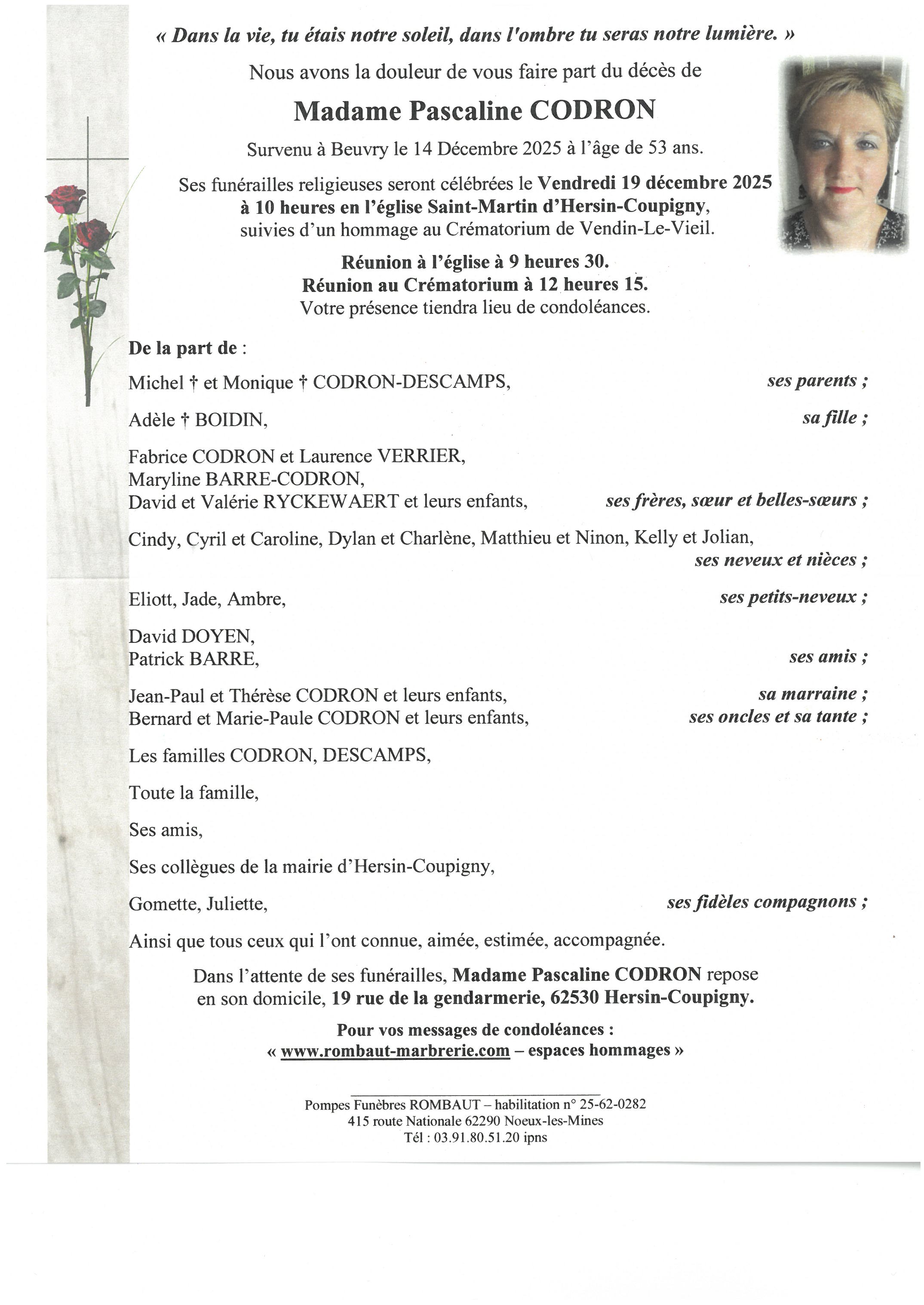 C’est avec une grande tristesse que nous vous annonçons le décès de Pascaline CODRON survenu le dimanche 14 décembre 2025 à Beuvry. La cérémonie se déroulera le vendredi 19 décembre 2025 à 10h00 à l’adresse suivante : Eglise Saint-Martin - 2 Rue Laure Mauduit - 62530 Hersin-Coupigny.