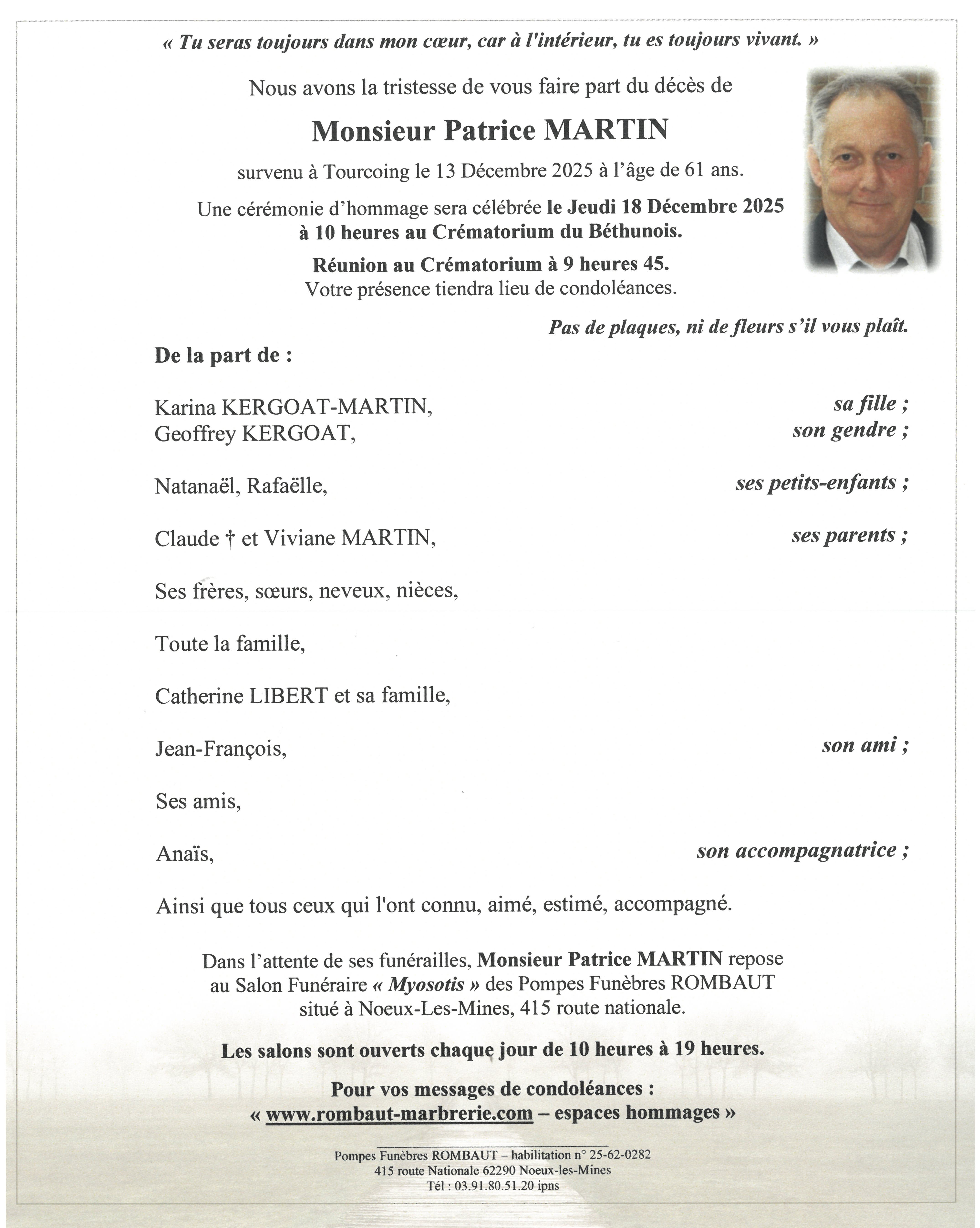 C’est avec une grande tristesse que nous vous annonçons le décès de Patrice MARTIN.