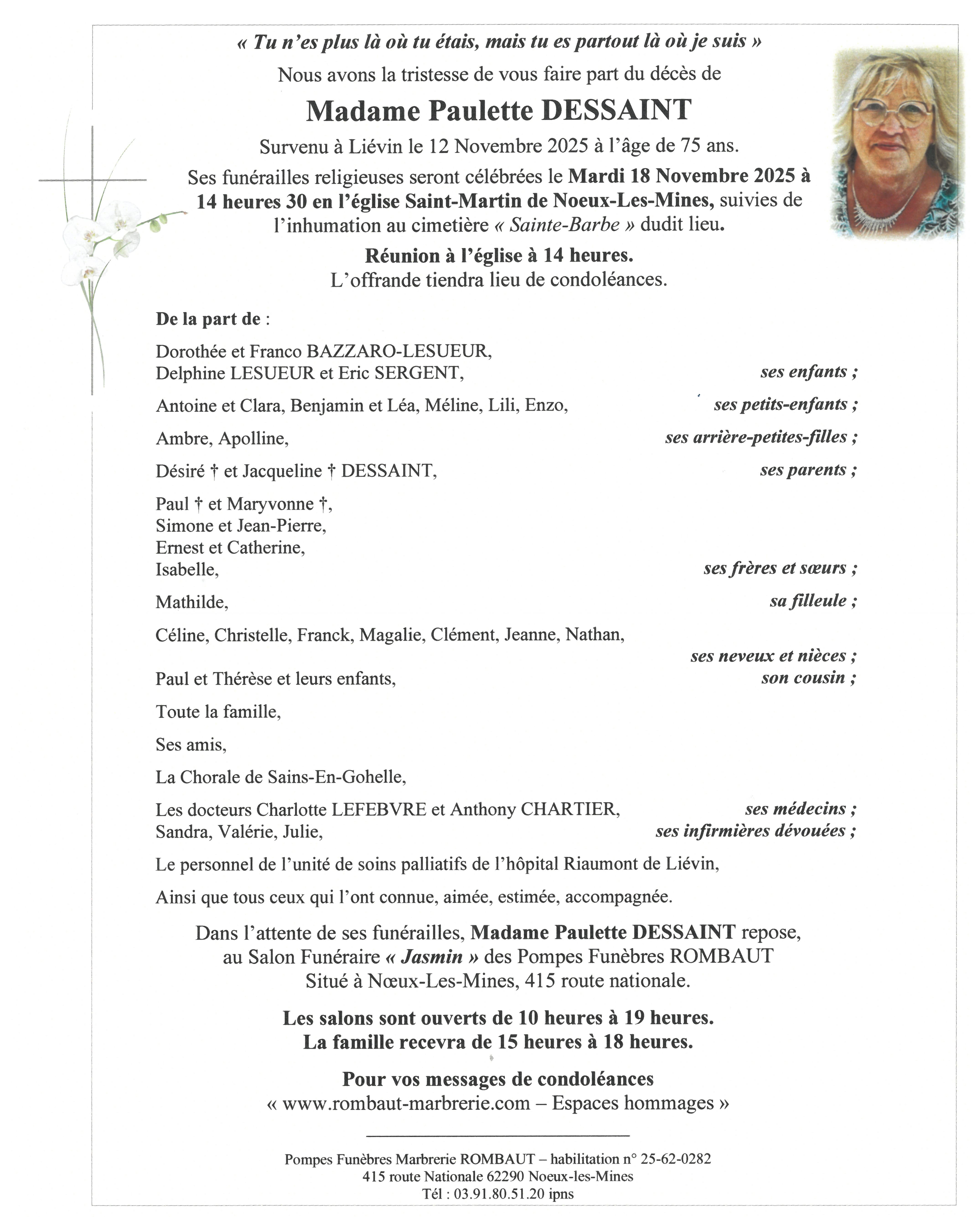 C’est avec une grande tristesse que nous vous annonçons le décès de Paulette DESSAINT survenu le mercredi 12 novembre 2025 à Liévin.