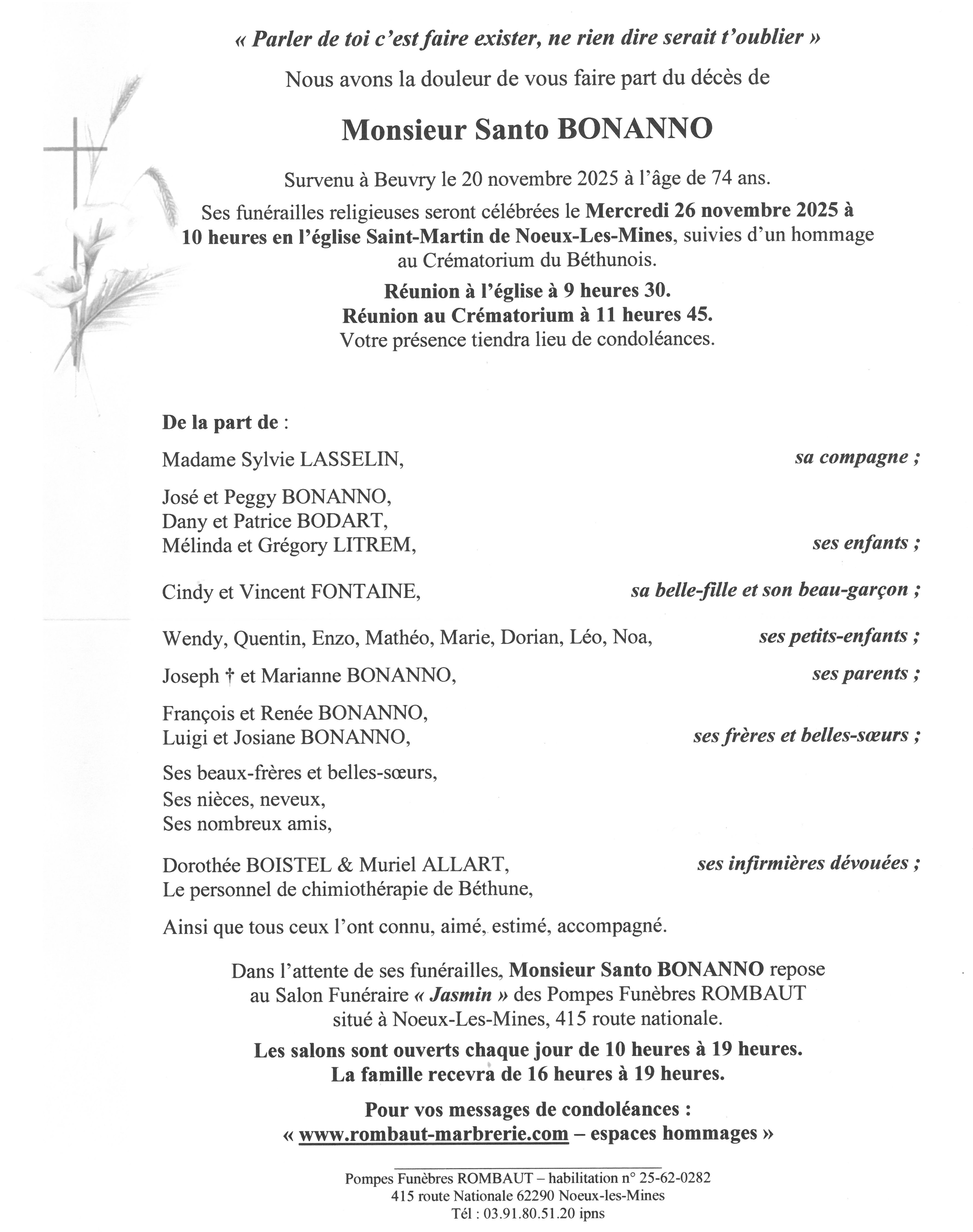 C’est avec une grande tristesse que nous vous annonçons le décès de Santo BONANNO survenu le jeudi 20 novembre 2025 à Beuvry.