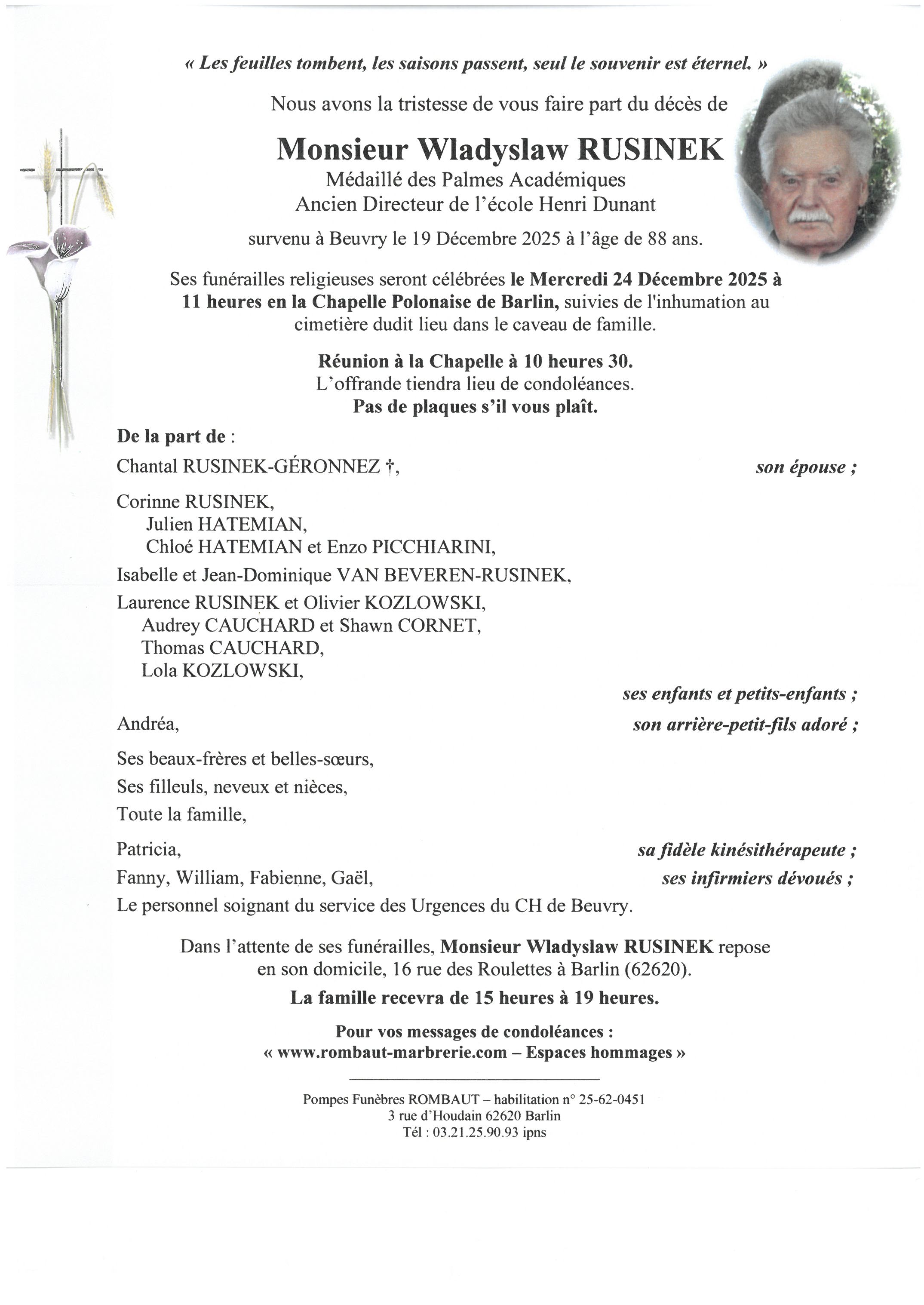 C’est avec une grande tristesse que nous vous annonçons le décès de Wladyslaw RUSINEK survenu le vendredi 19 décembre 2025 à Beuvry. La cérémonie se déroulera le mercredi 24 décembre 2025 à 11h00 à l’adresse suivante : Chapelle Polonaise de Barlin - 32, Rue François Arago - 62620 Barlin.